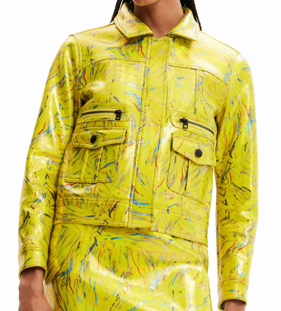 DESIGUAL dámská stylová bunda vyrobena s efektem šupin s uměleckými prvky. Zapínání na skrytý zip a druky. Dvě kapsy se zapínáním na zip a dvě kapsy s klopou a druky.