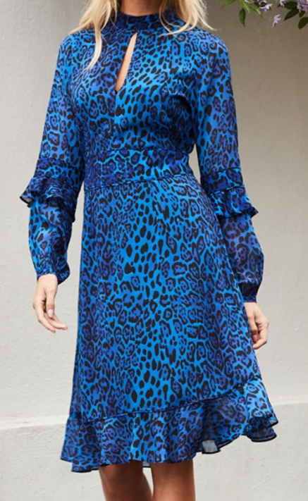 Sosandar dámské luxusní šaty v modré barvě s leopardím vzorem. Dlouhý rukáv. Volánkový lem. Zapínání na zip a knoflíčky na zadní straně.