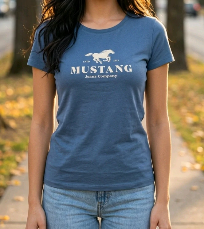 MUSTANG originální dámské pohodlné tričko v modré barvě s krátkým rukávem, zdobené tradičním nápisem logem Mustang.