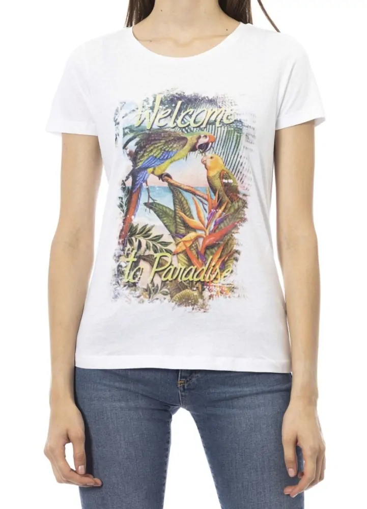 Trussardi dámské tričko v bílé barvě s barevným potiskem na přední straně, krátkým rukávem a kulatým výstřihem, poštovné i osobní odběr zdarma.